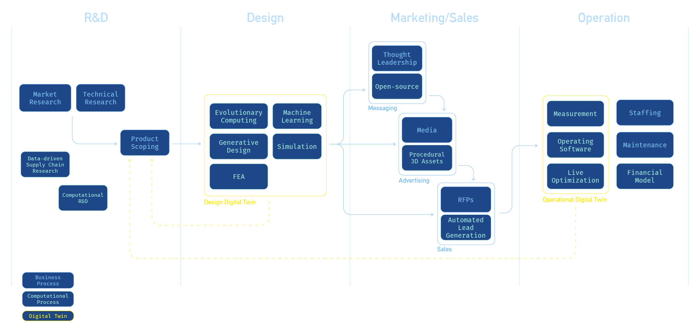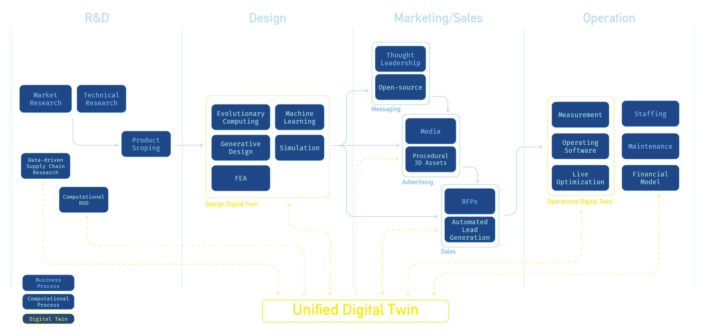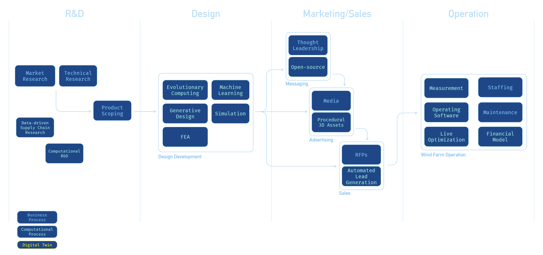 Digital twins are most commonly employed in 3D, physical use cases like our wind-farm, but similar computational processes are taking place all throughout an organization.