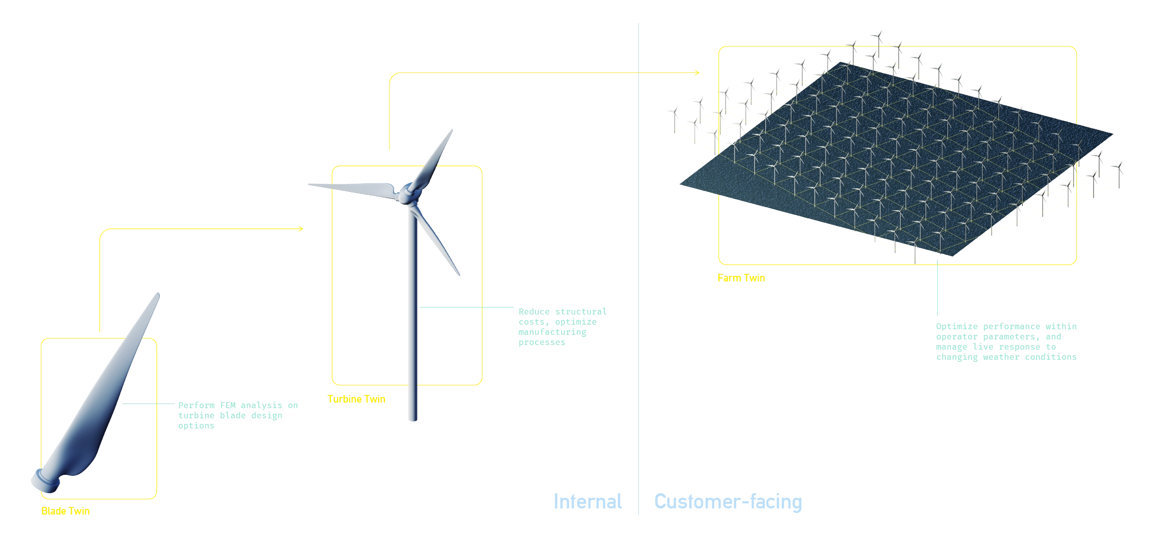 Digital twins used in the product pipeline In the design process, these digital twins might visualize, measure, and compare potential solutions to wind-turbine design problems. In operational contexts, they could be monitoring and managing real-world wind farms, and collecting data from performance tests that can be used to inform future design development.