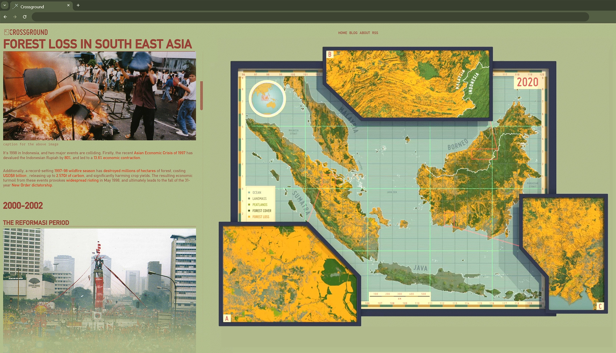 By processing and animating decades of satellite data, this report reveals the underlying political, economic and environmental factors driving forest loss in South America and South East Asia.