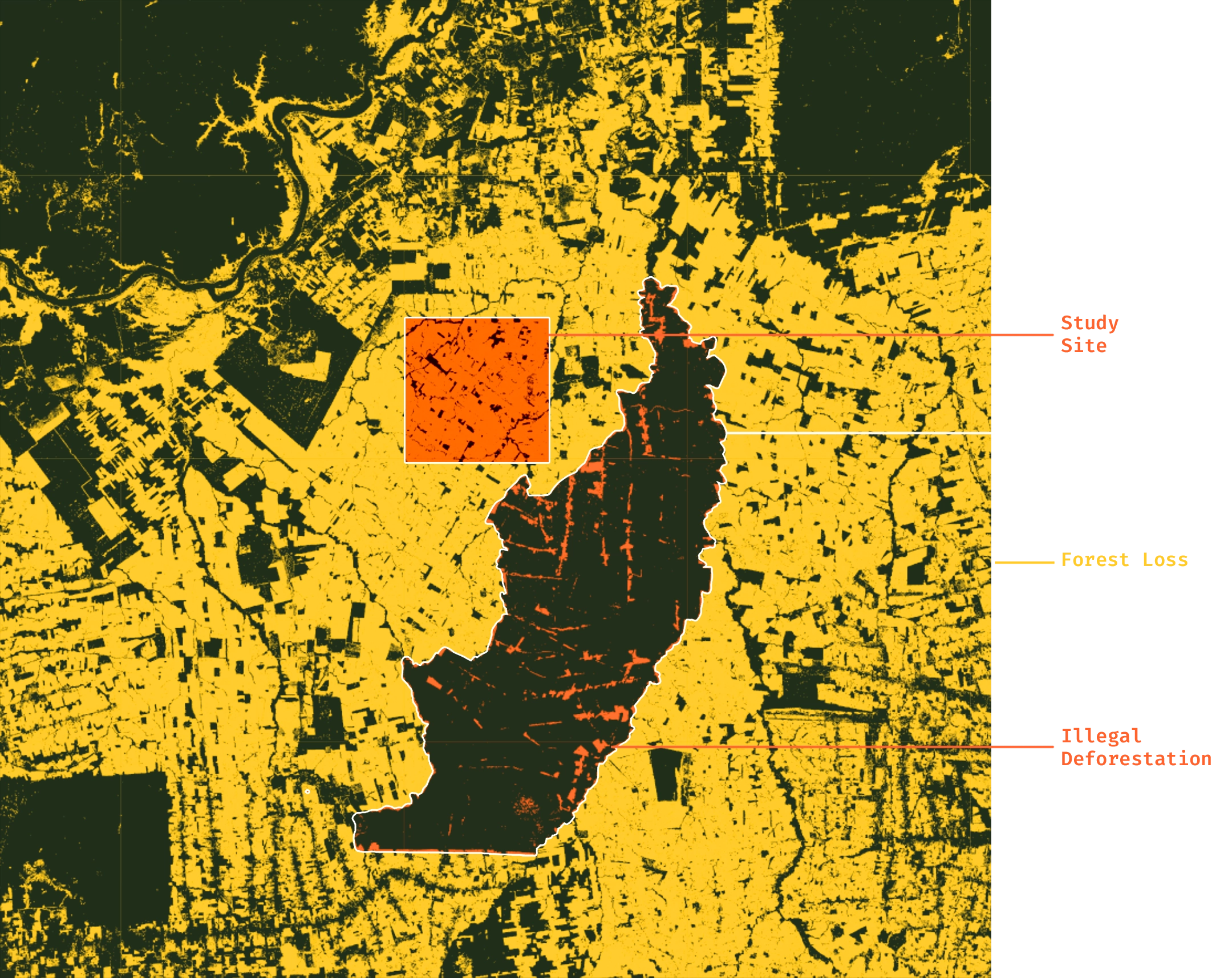 The site is within The Gran Chaco: South America's second largest forest. Here, cattle ranching is the primary driver of forest clearing, which uses mechanized methods to clear large, rectangular patches of land.