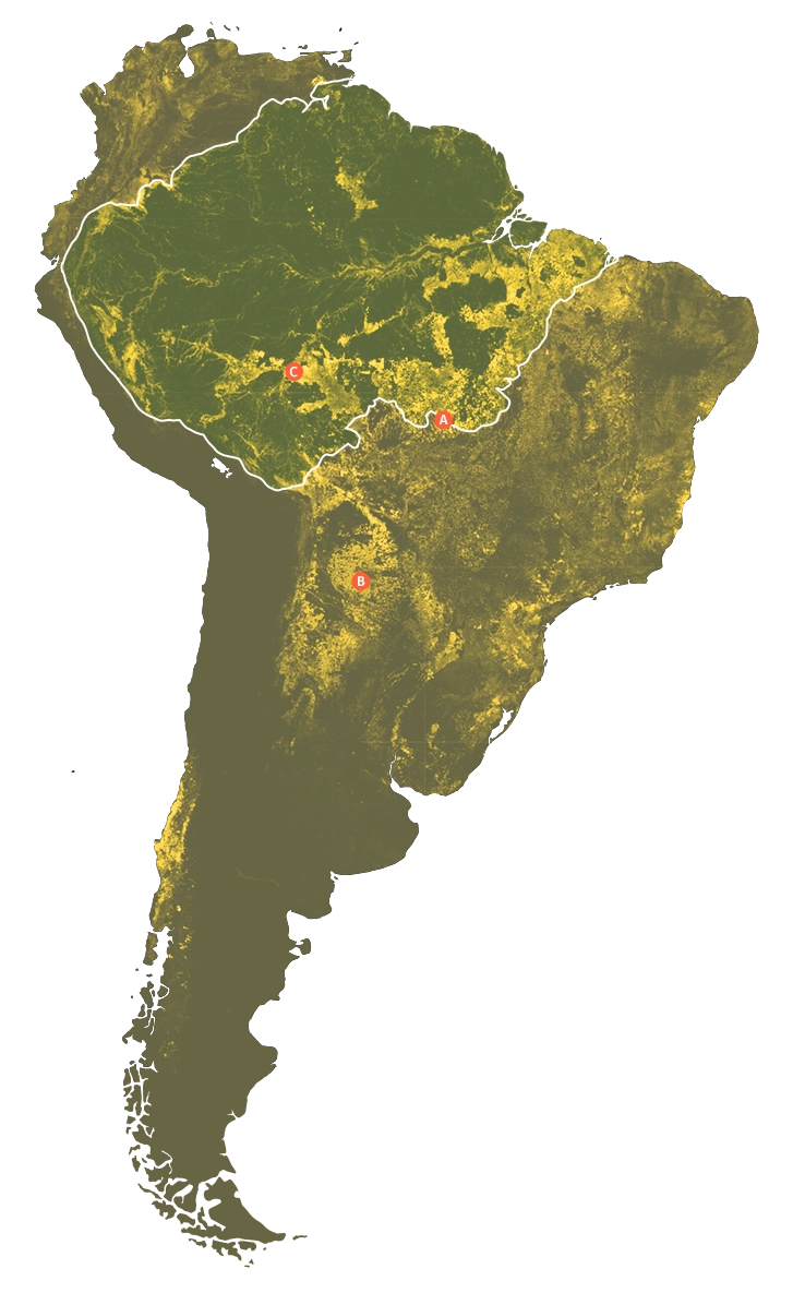 Let's begin by zooming into three sites in South America: where different economic, political and environmental factors converge to create different patterns of forest loss.