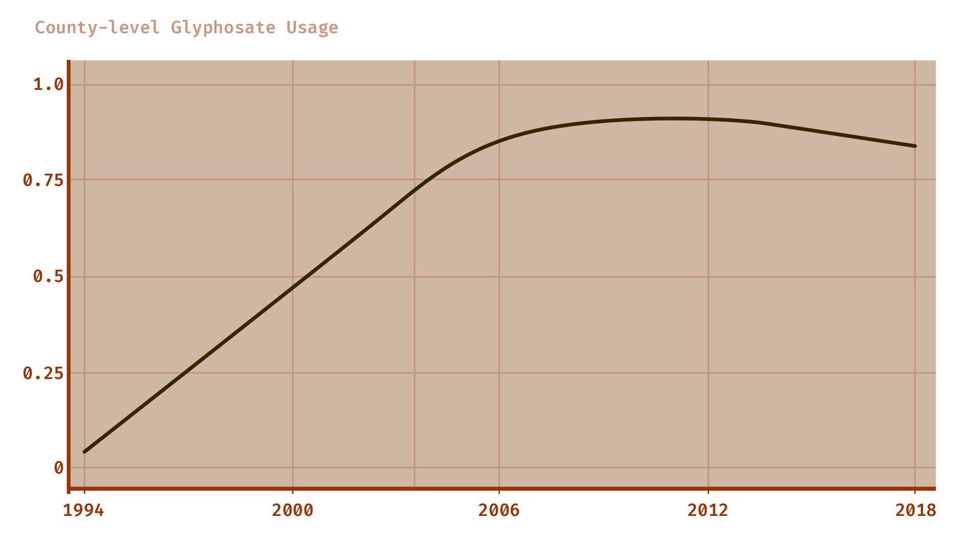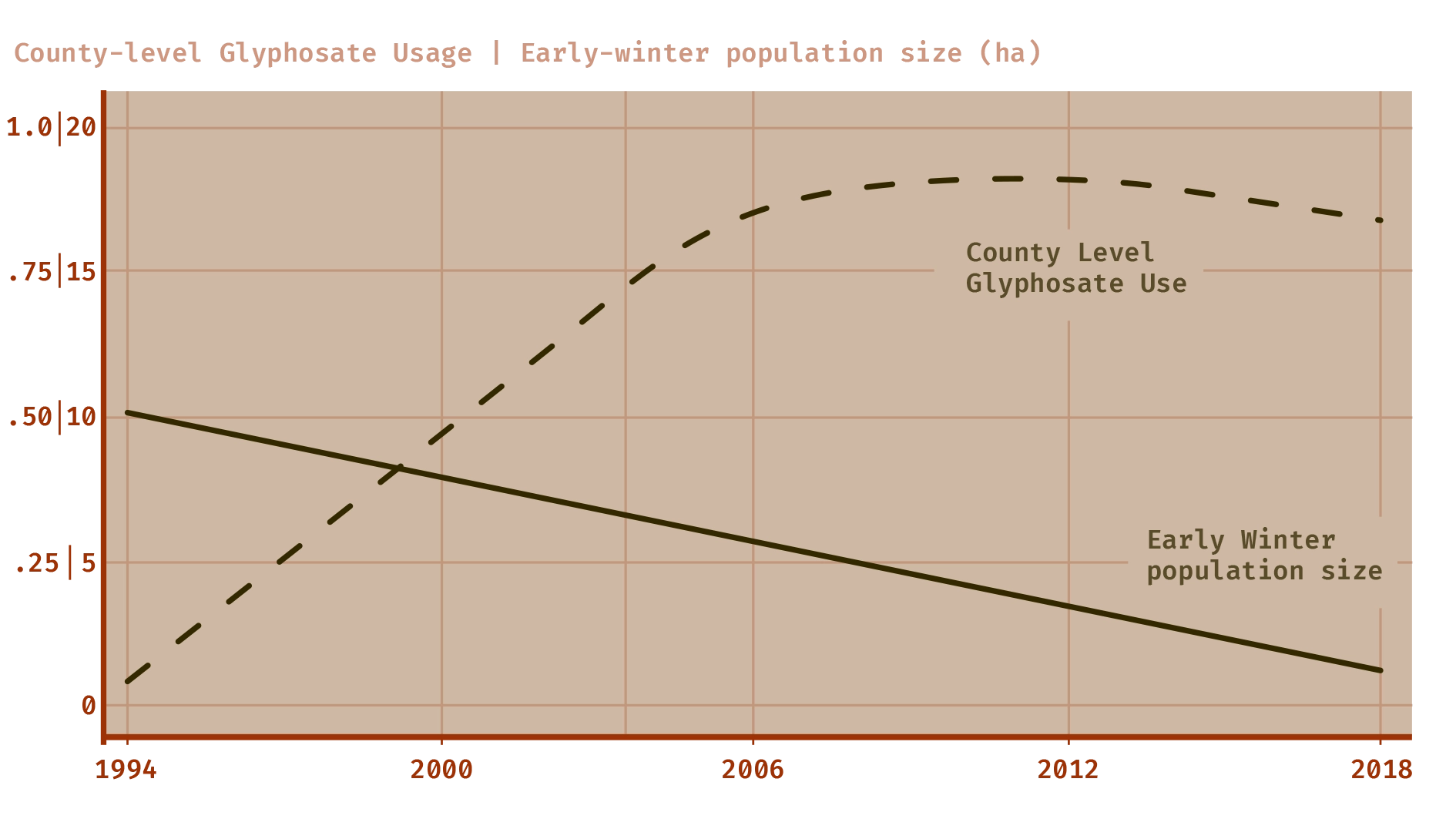 Monarch population numbers declined most sharply in the 1990s, coinciding with the widespread adoption of glyphosate-resistant crops in the US. As glyphosate usage leveled off in the 2000s, monarch numbers continued to steadily decline, suggesting that while impactful, milkweed abundance alone doesn't explain the ongoing collapse.