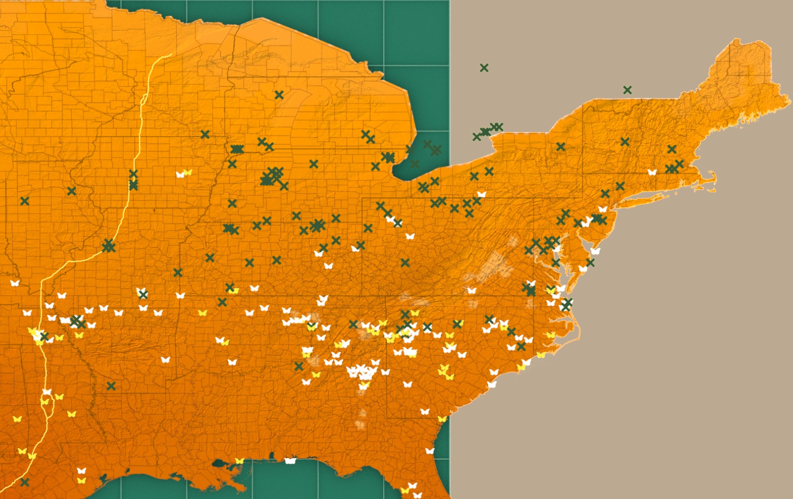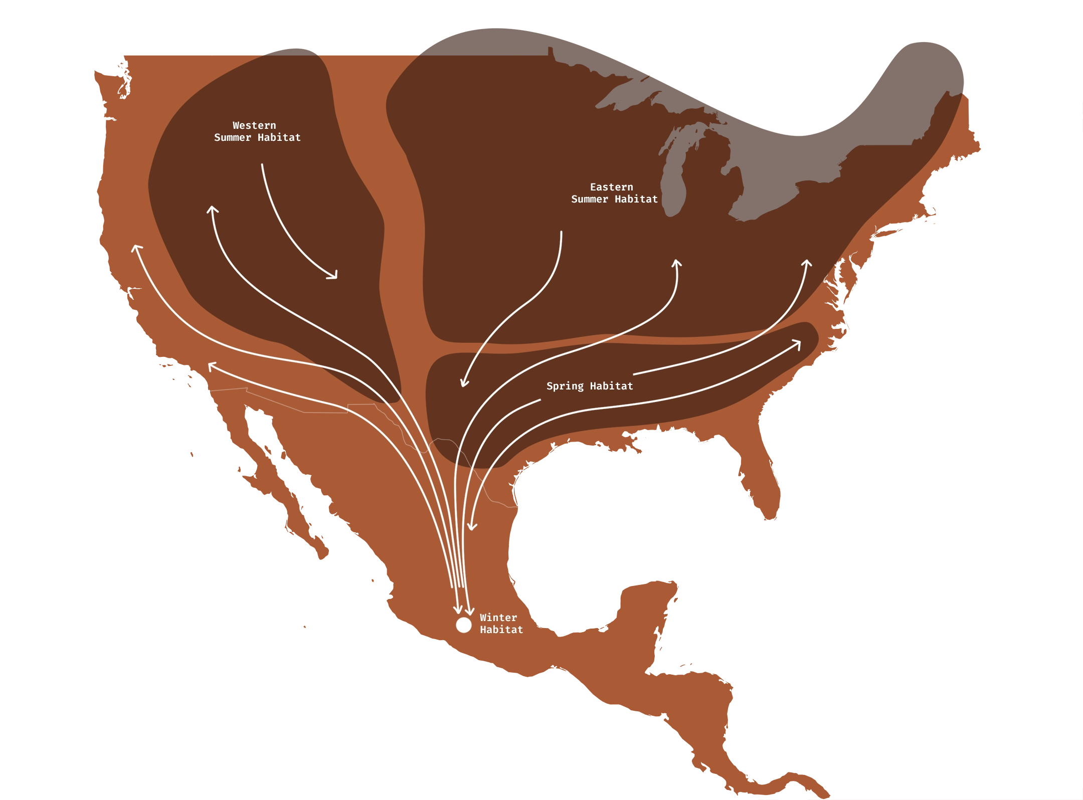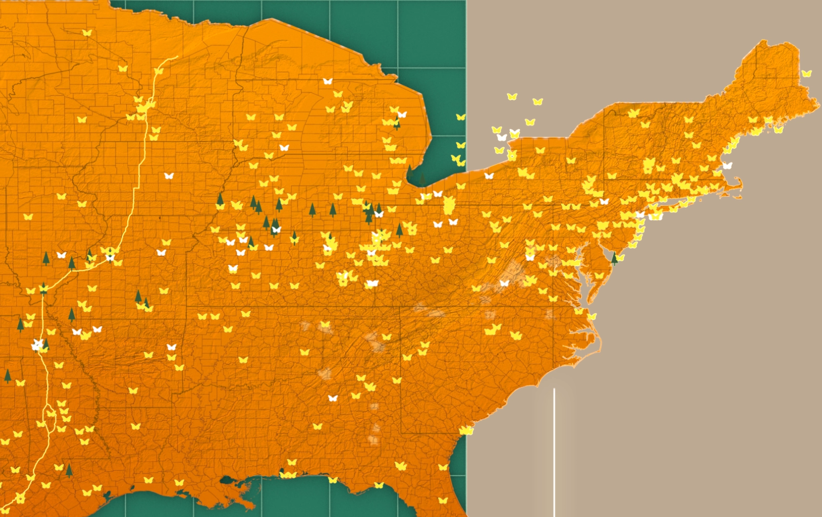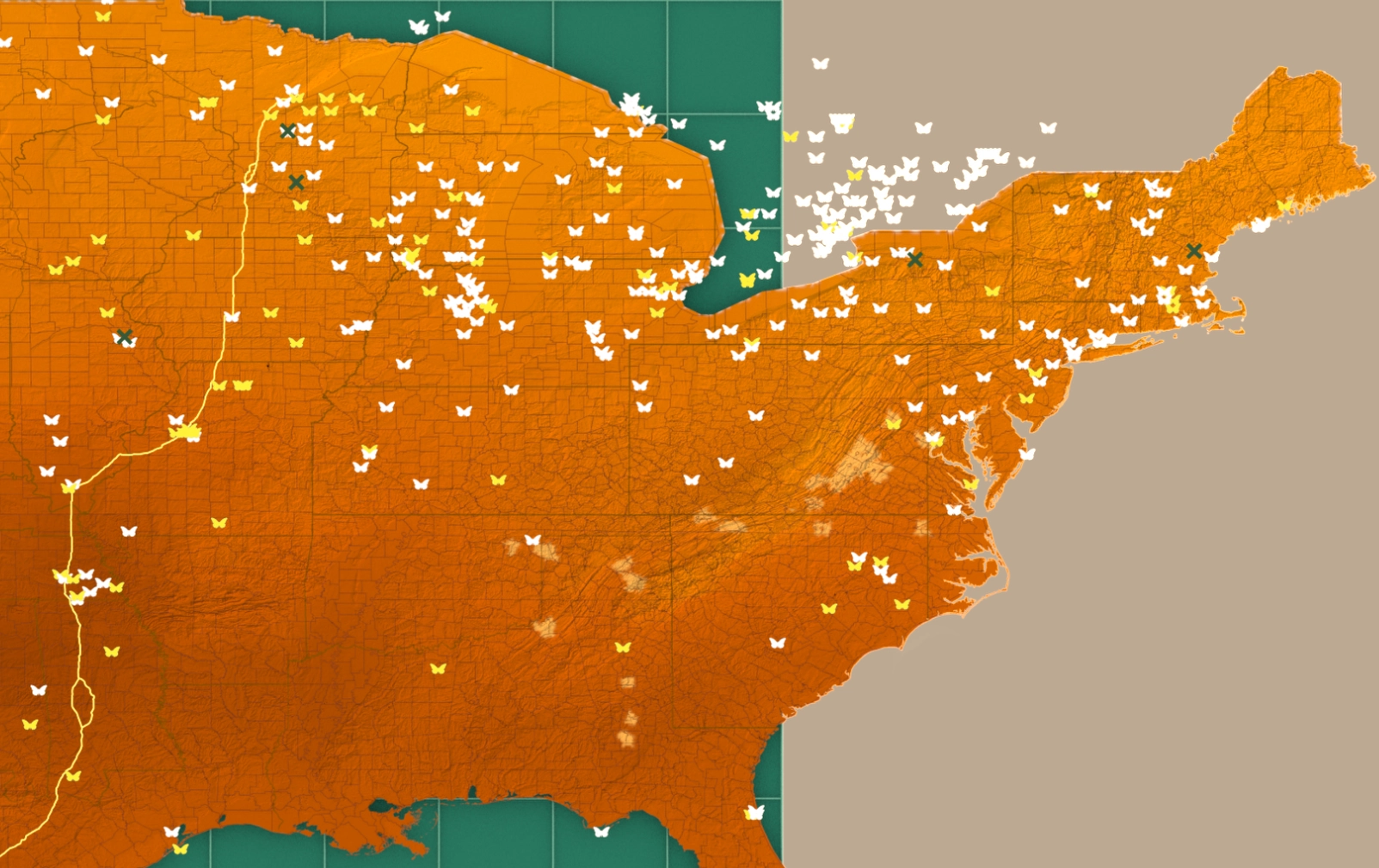 Each year, monarchs journey from their winter habitat in Southern Mexico to breeding grounds in the US. Sightings are recorded by citizen scientists throughout the region, and made available by Journey North.