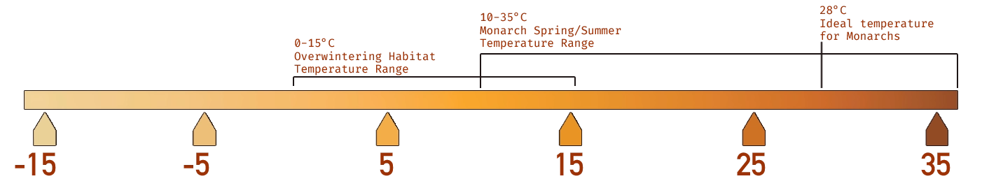 As temperatures increase in spring and summer, Northern US states become habitable for monarchs, and they are able to migrate further north. Monthly county-level temperature data from NOAA shows how these thresholds impact the migration.