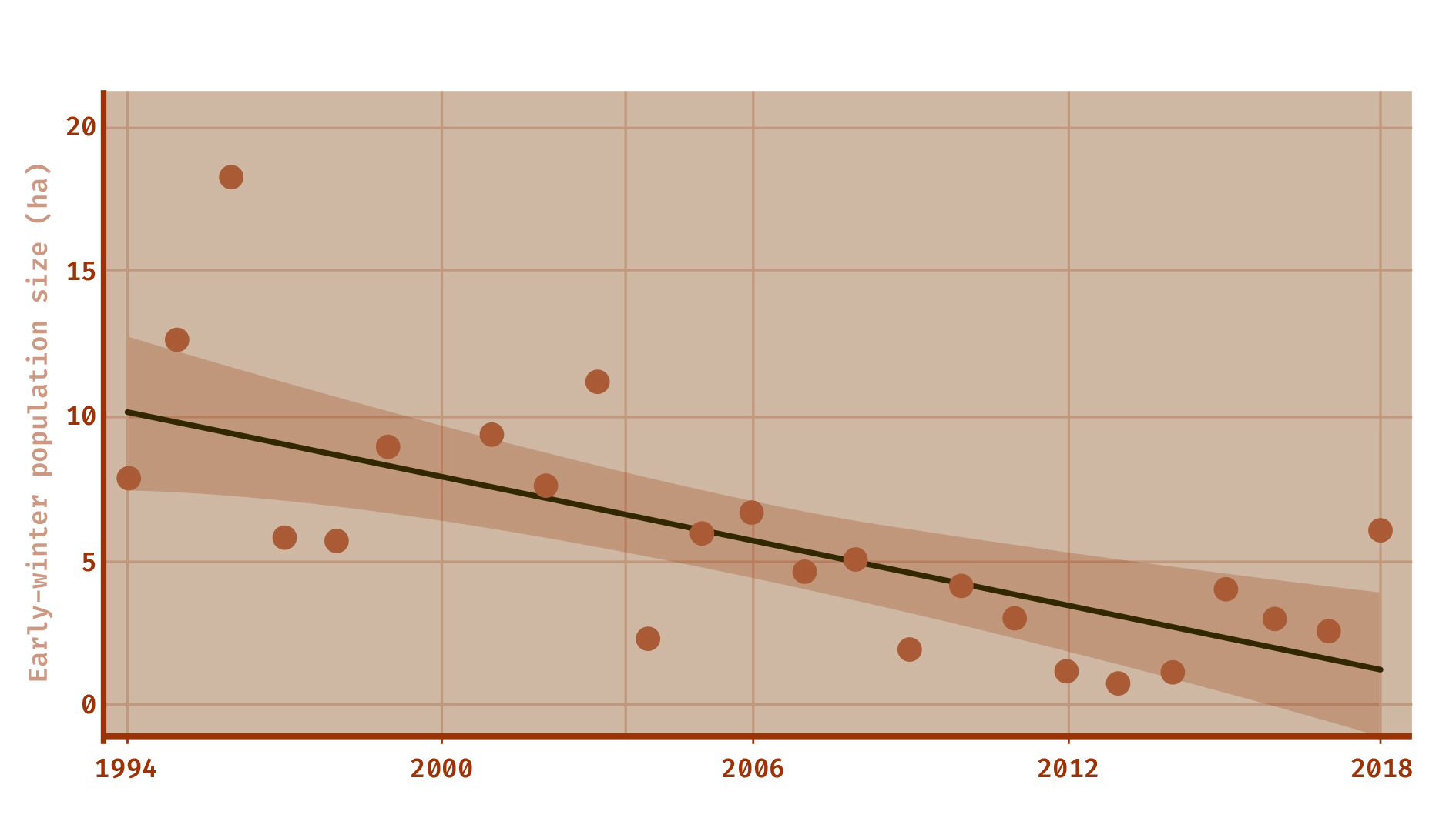 The overall size of these colonies has been plummeting: by more than 80% in the past 30 years. The sharpest decrease happened in the 1990s, before a steady decline throughout the 2000s and 2010s.