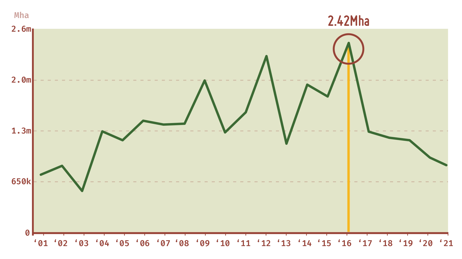 Twenty-three companies face consequences from the Indonesian government in the immediate aftermath of the 2015 fires, which are estimated to have caused more than $16bn of damage. Ashes left behind by the fires form fertile soils, and large swathes of land are converted to agricultural grasslands. Coupled with the loss of a further 2.42Mha, Indonesian deforestation levels in 2016 are the highest on record.