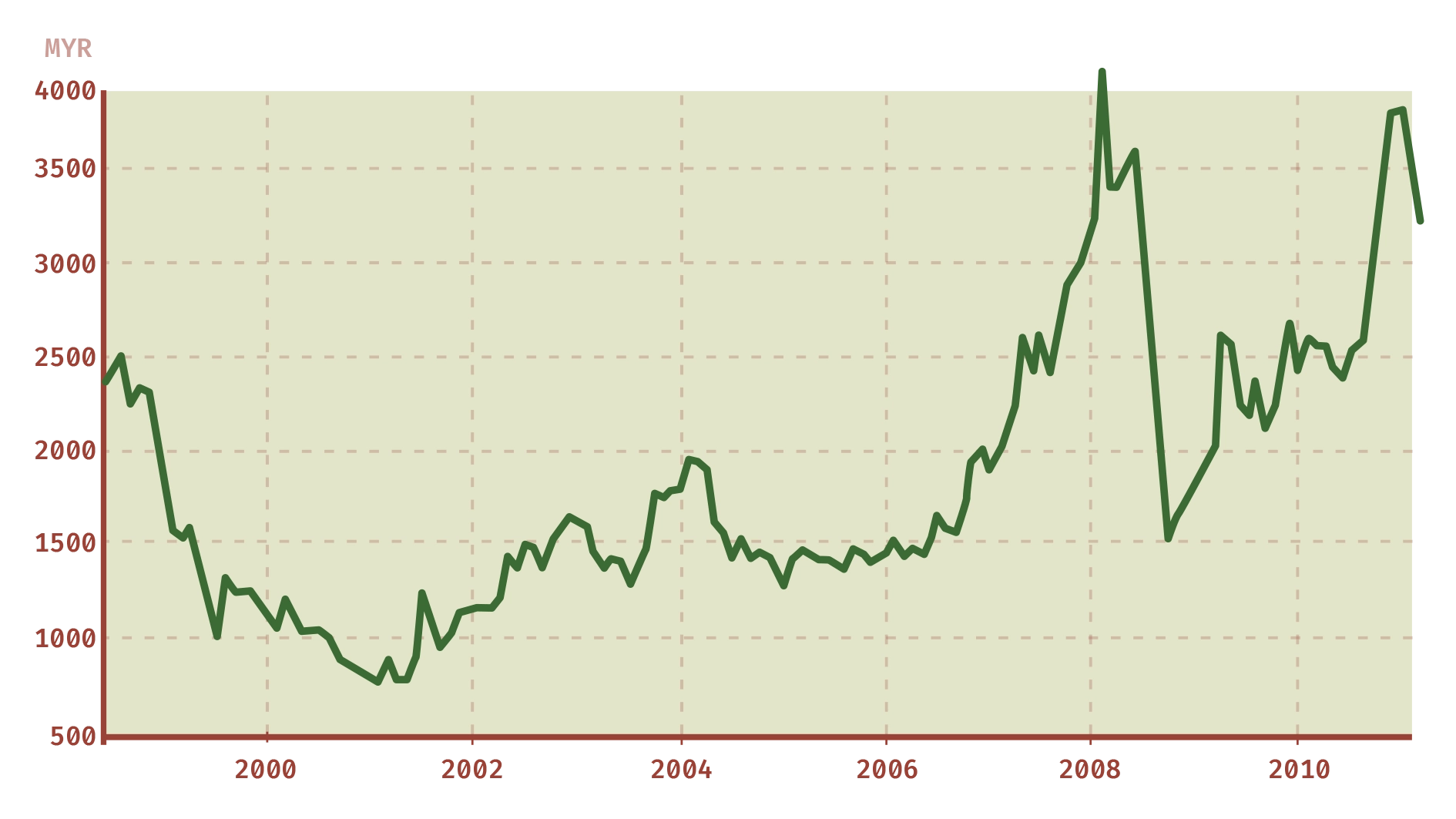 Forest loss in the first half of the decade averages 932Kha per year. By 2010, this rate has grown to 1.437Mha per year. Total Oil Palm plantation area reached 7.65Mha - 96% of its 2005 target to increase its plantation area from 5 to 8 million hectares. With palm oil prices jumping by 175% in a decade, the incentives for forest clearing are greater than ever.