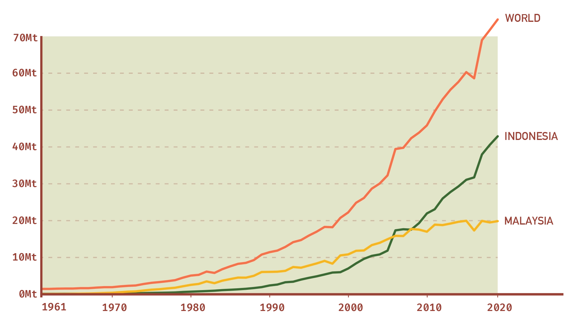 During this time, Palm Oil has increased in popularity, driven by the growth of demand from China, and the desire of Western markets to phase out hydrogenated vegetable oils in favor of healthier options. The low cost, remarkable efficiency, and natural saturation of Palm Oil makes it an ideal replacement, and by 2005, oil palm plantations surpass timber to become the primary driver of deforestation in Indonesia.